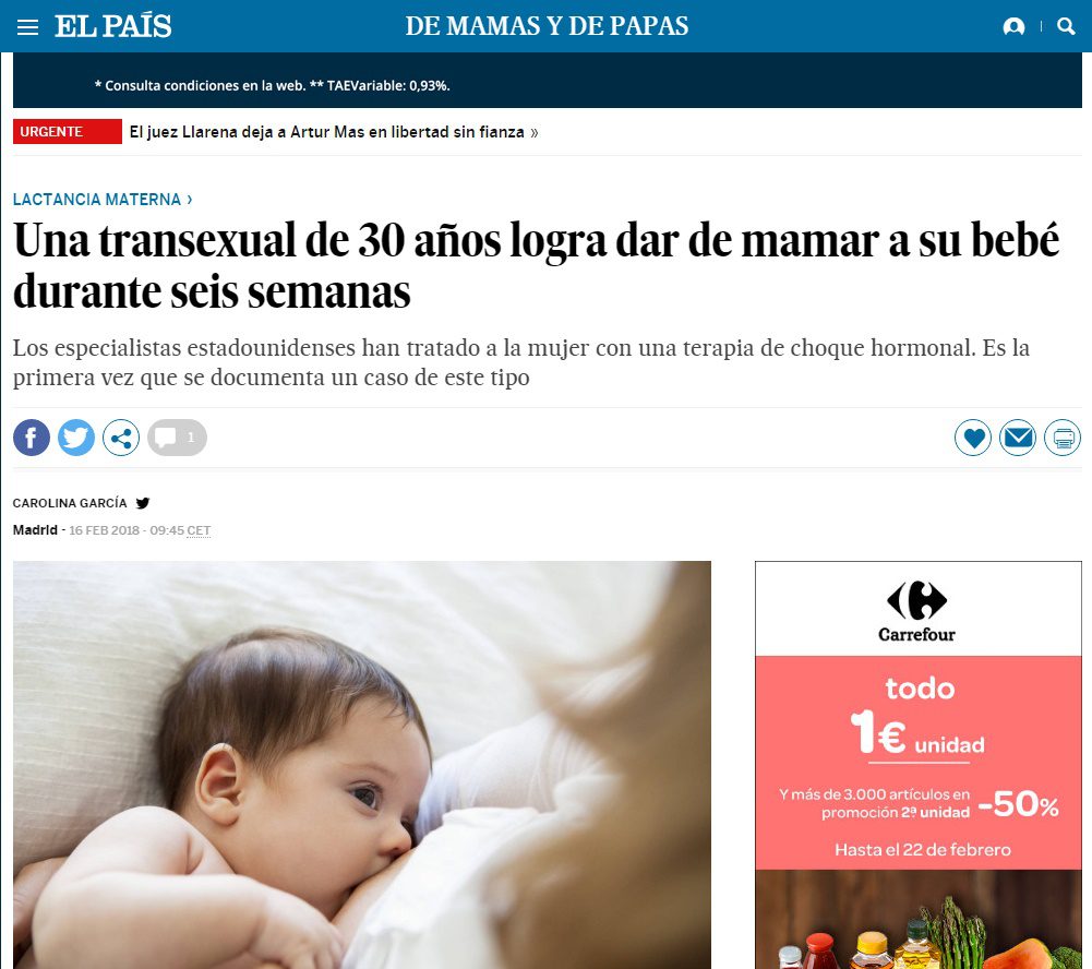 Una mujer transexual de 30 años consigue dar el pecho a su bebe con éxito.